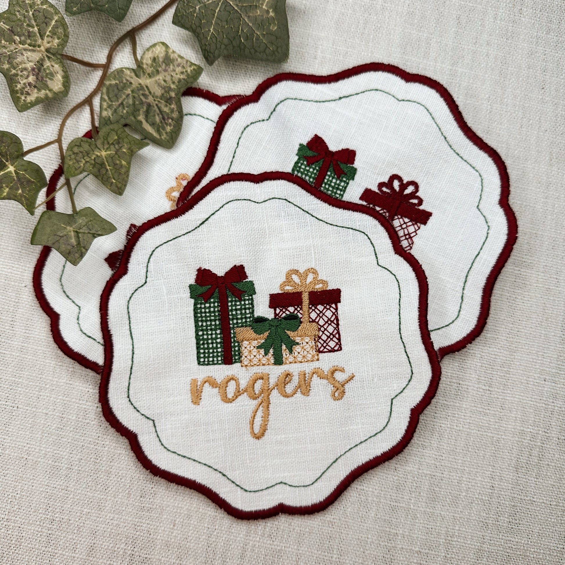 Embroidered linen Christmas cocktail napkins are a great item for that extra touch when hosting. Custom cocktail napkins make a perfect wedding, wedding shower, housewarming, hostess or holiday gift. 60/40 Linen/Cotton blend fabric. Sold as a set of four.
