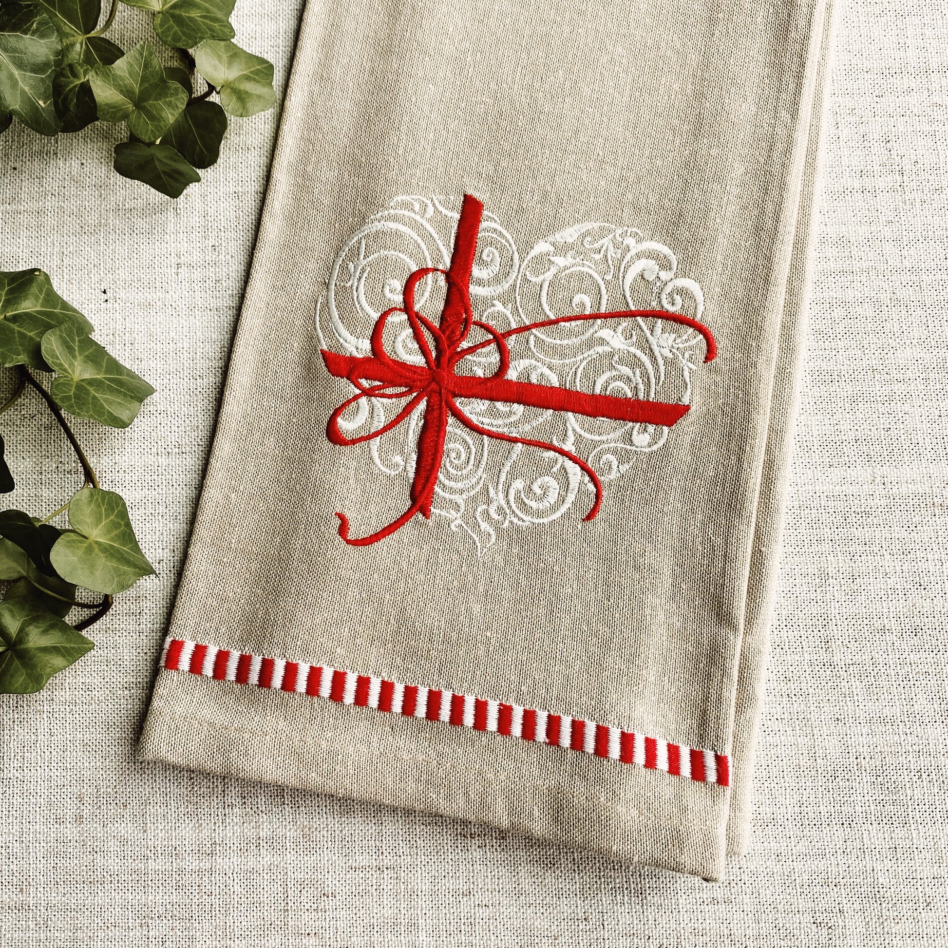 Our most favorite Valentine embroidered kitchen towel! Featuring lovely embroidered dobby trim detailing.