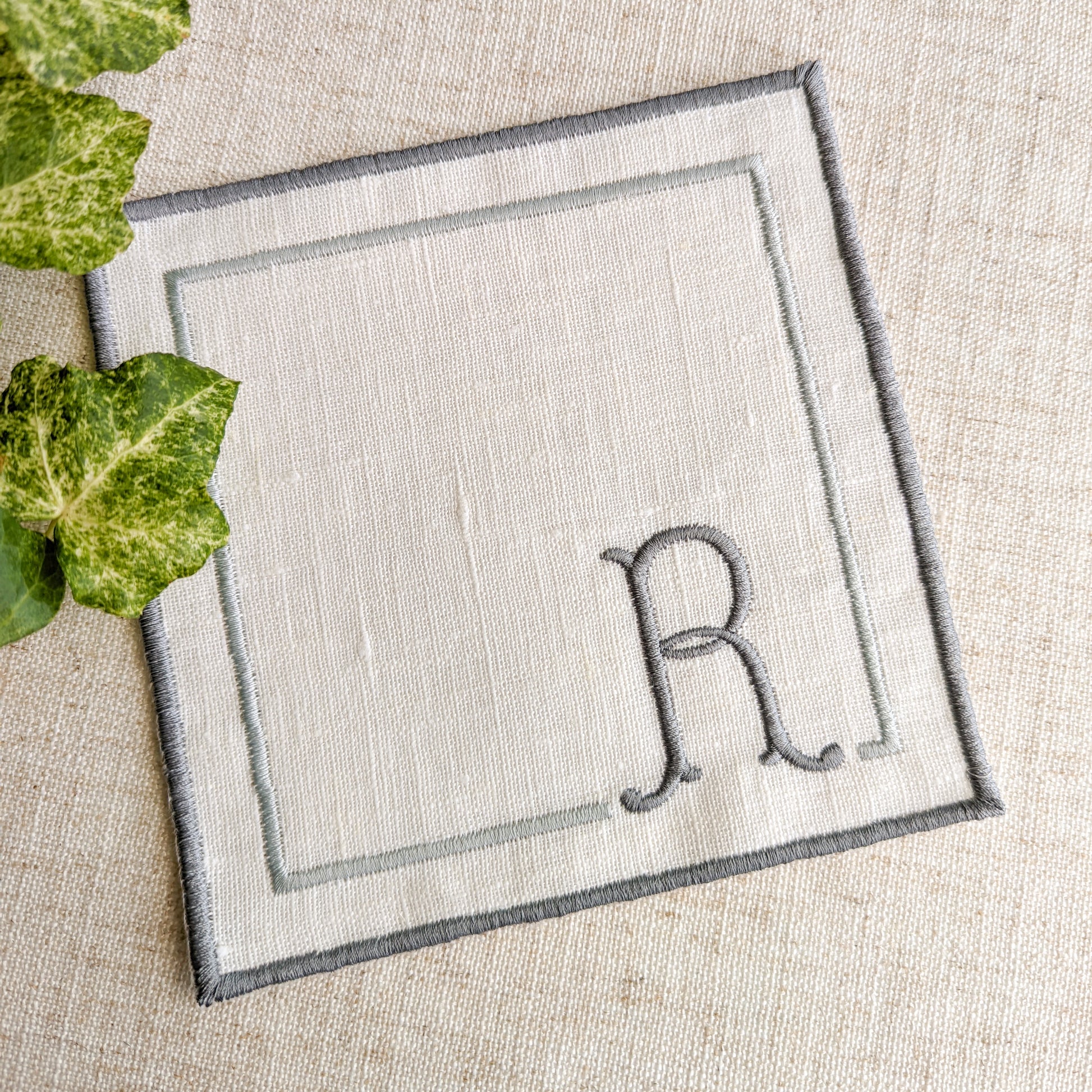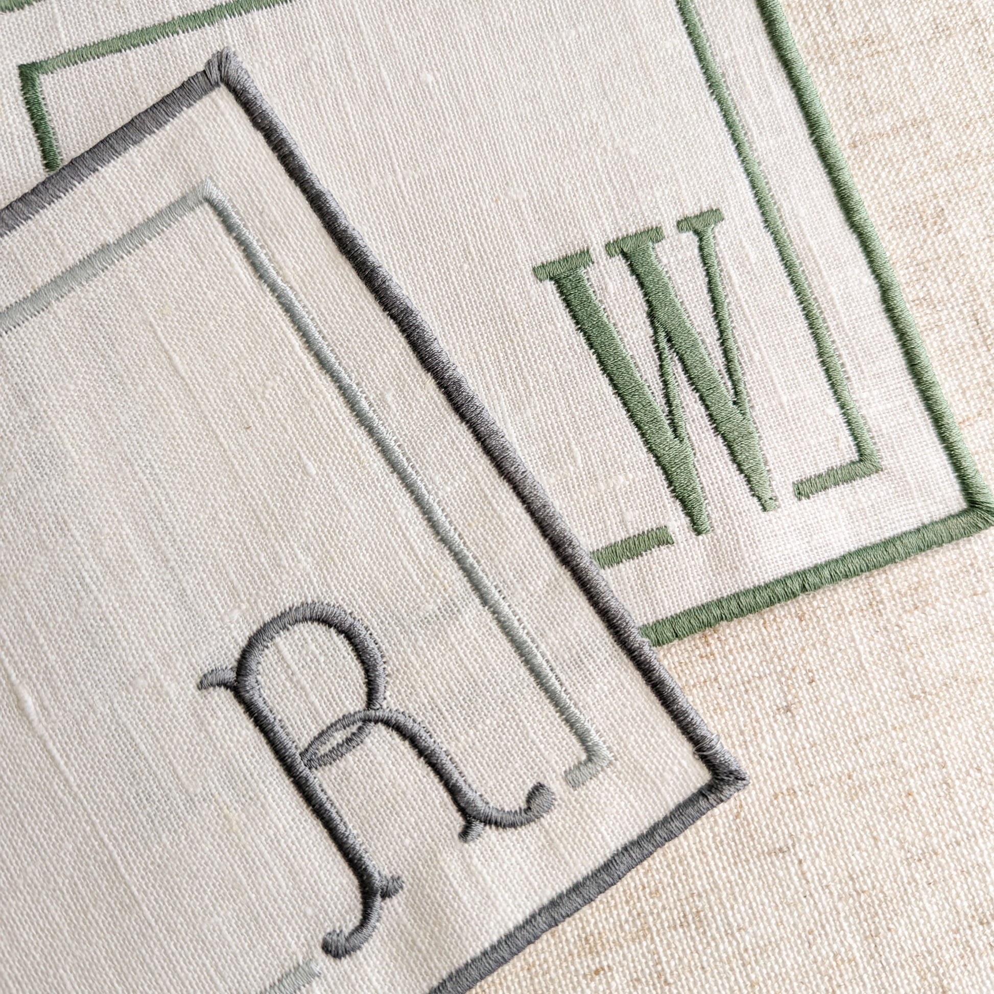 Our linen cocktail napkins will certainly add a little cheer to any gathering! How cute would these be as a gift with a nice bottle of wine! Create your own by choosing font and thread choice! Set of four. 100% Linen.