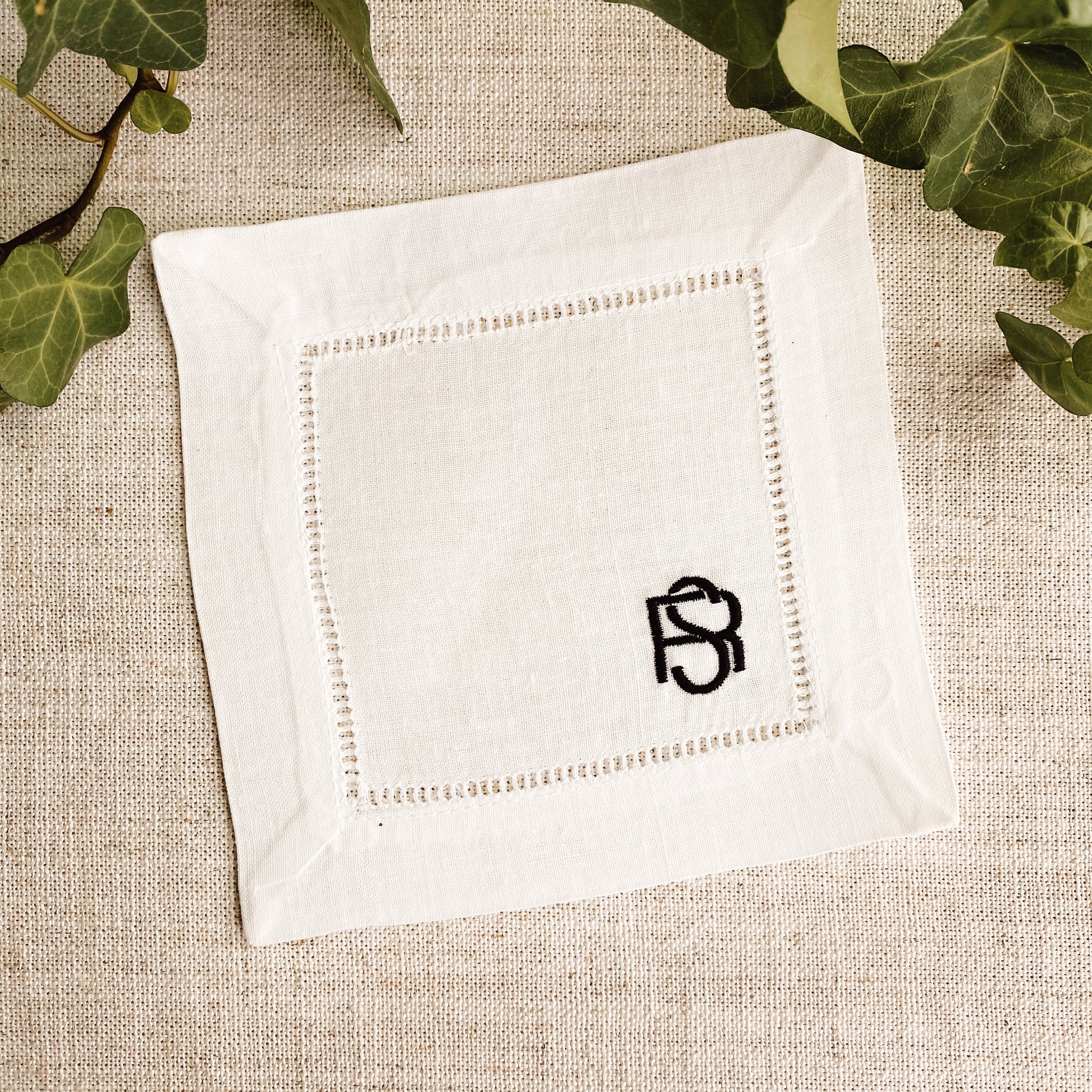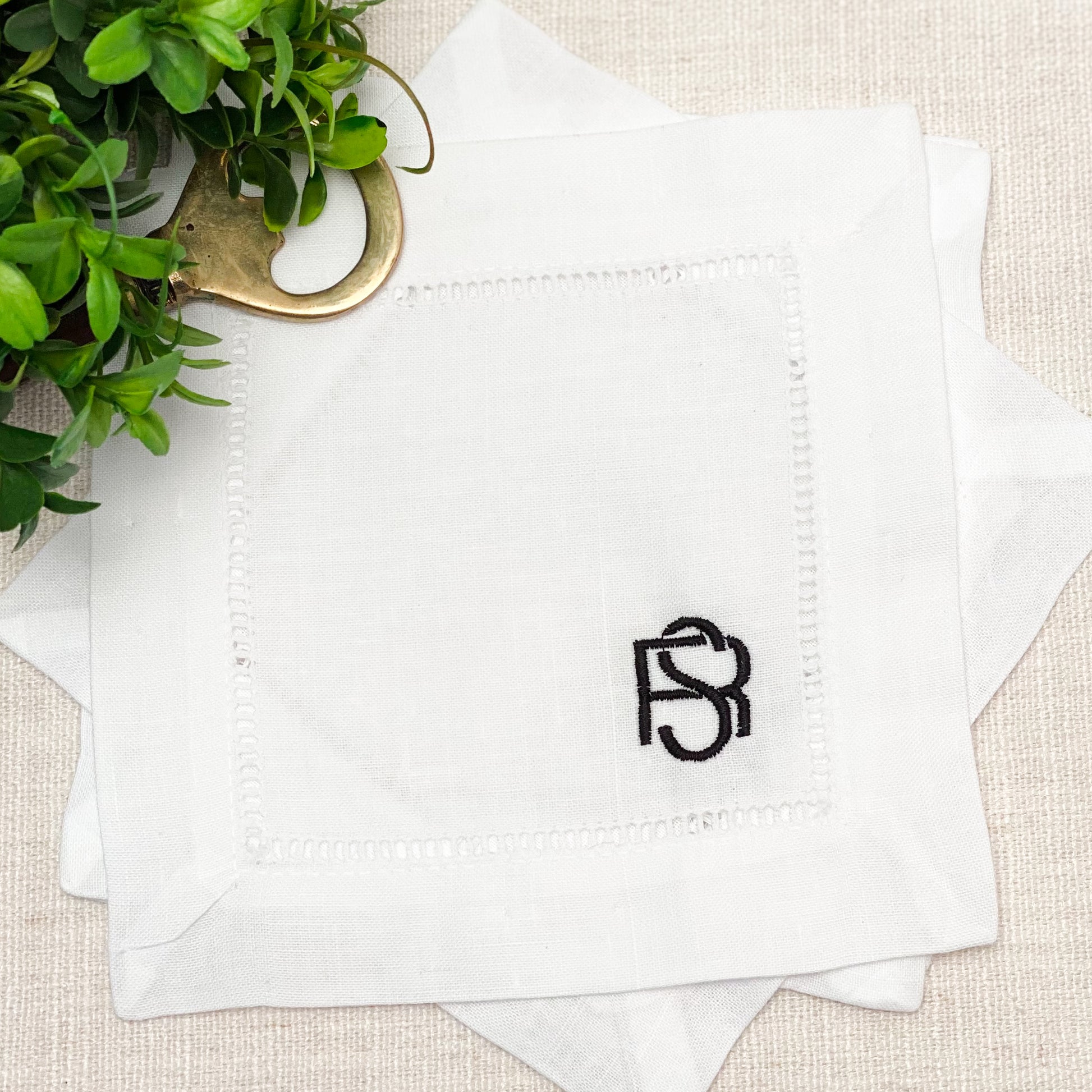 Gorgeous monogrammed cocktail napkins with our Maisie font. You may choose two colors or one, your choice. Let us know! Napkins measure 6" x 6" square and are made of a 60/40 linen/cotton. Set of four.