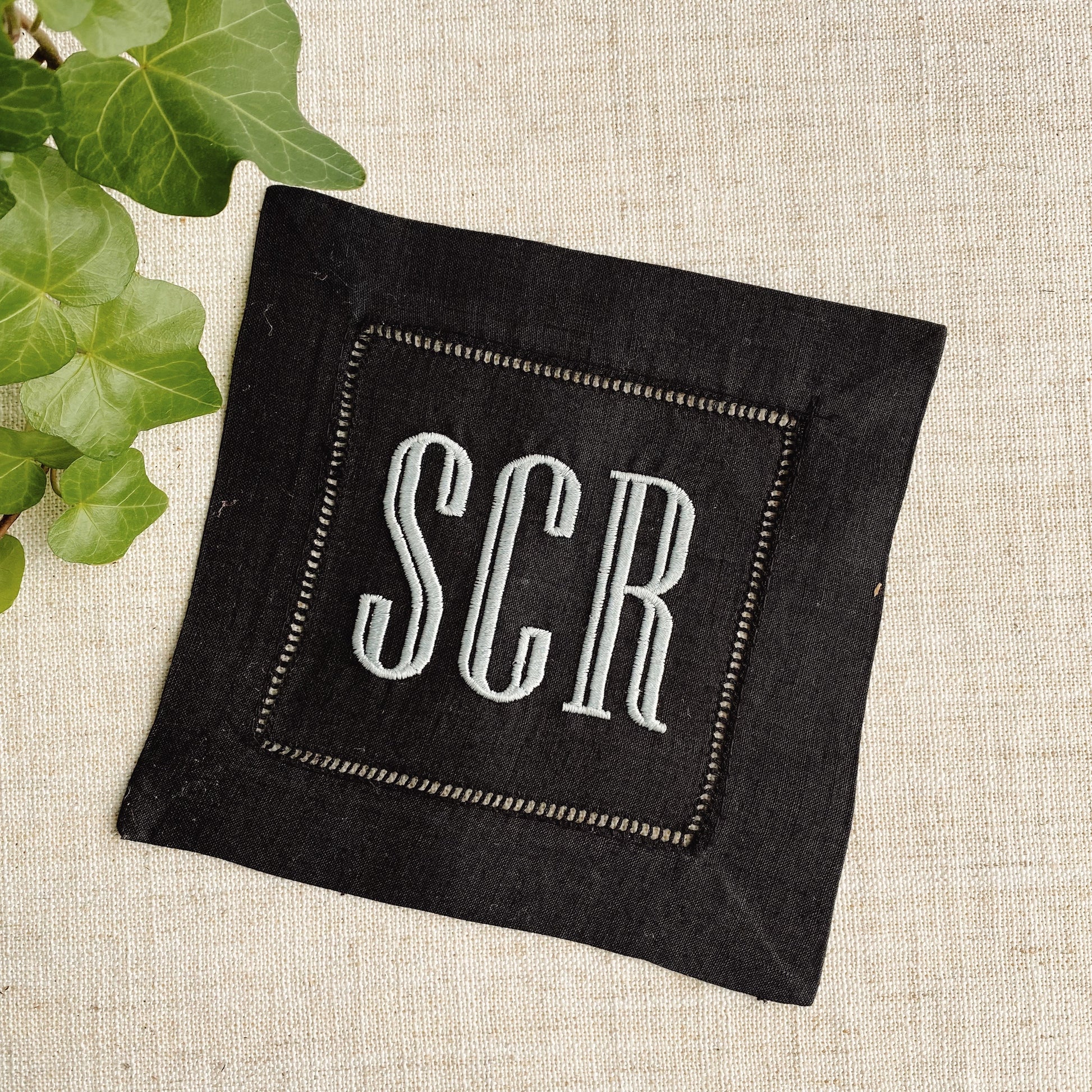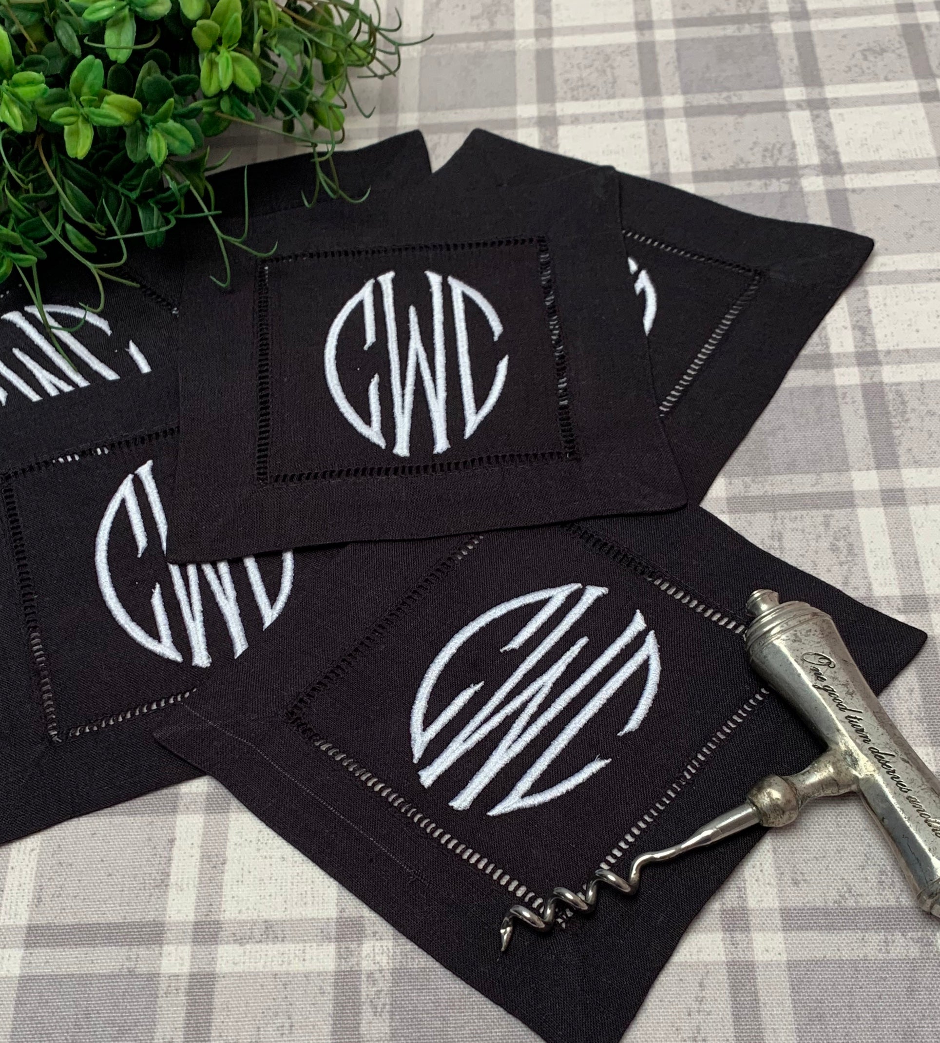 This beautiful monogrammed black linen cocktail napkins are the perfect wedding or engagement gift making a great addition to a bar cart! Sample shown on black linen with Emma font.