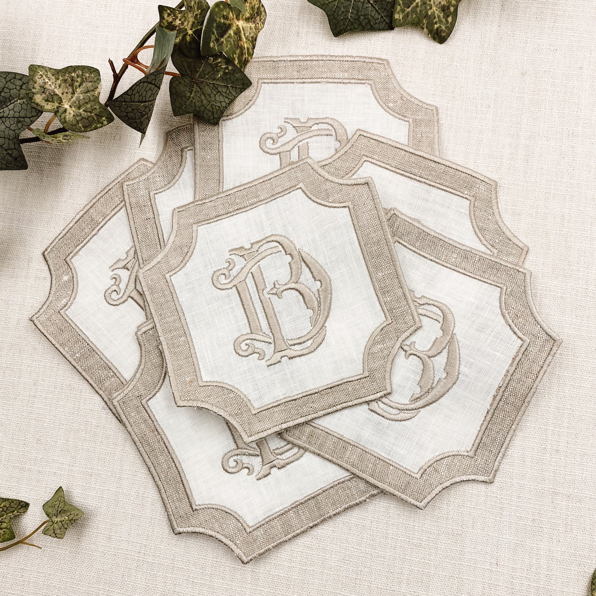 Our embroidered custom cocktail napkins are the perfect hostess gift! Customize with your thread choice and monogram. Thread shown in sample is beige. Sold as a set of four. 100% Linen. 6 x 6 inch coaster.